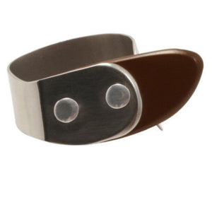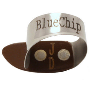 This is BlueChip's JD Crowe-style dobro/resonator thumb pick in a size medium. This is a slightly thicker blade design as compared to regular banjo picks to withstand the more strenuous use on a dobro. It is constructed using a custom designed stainless steel band and a 60/1000 of an inch(1.50mm) thick BlueChip pick. These picks are laser etched, professionally machined, and hand beveled to create the best thumb pick available.