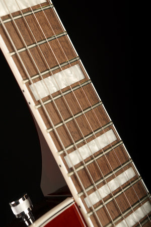 Chambered mahogany body with arched maple top for rich tone and balance