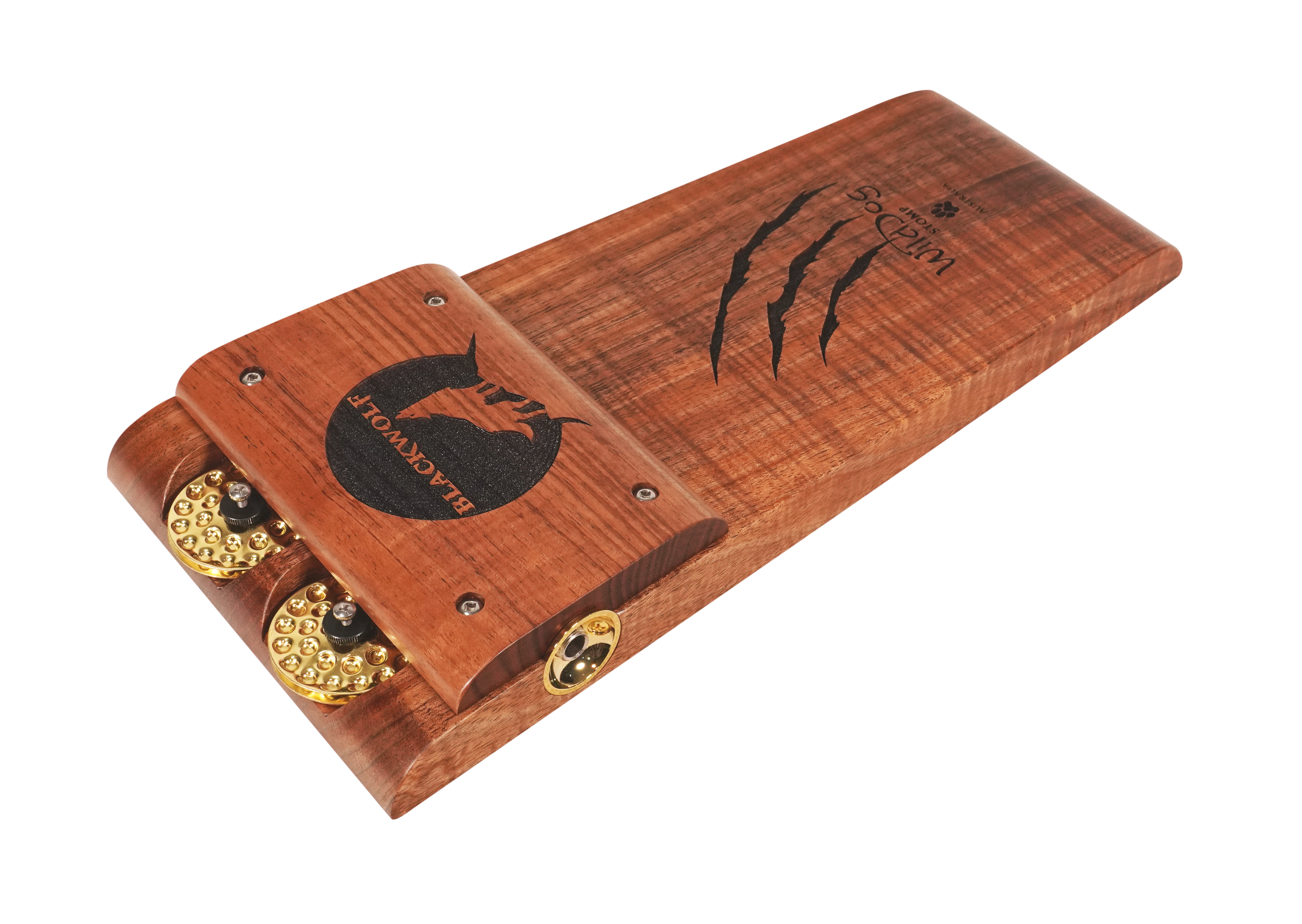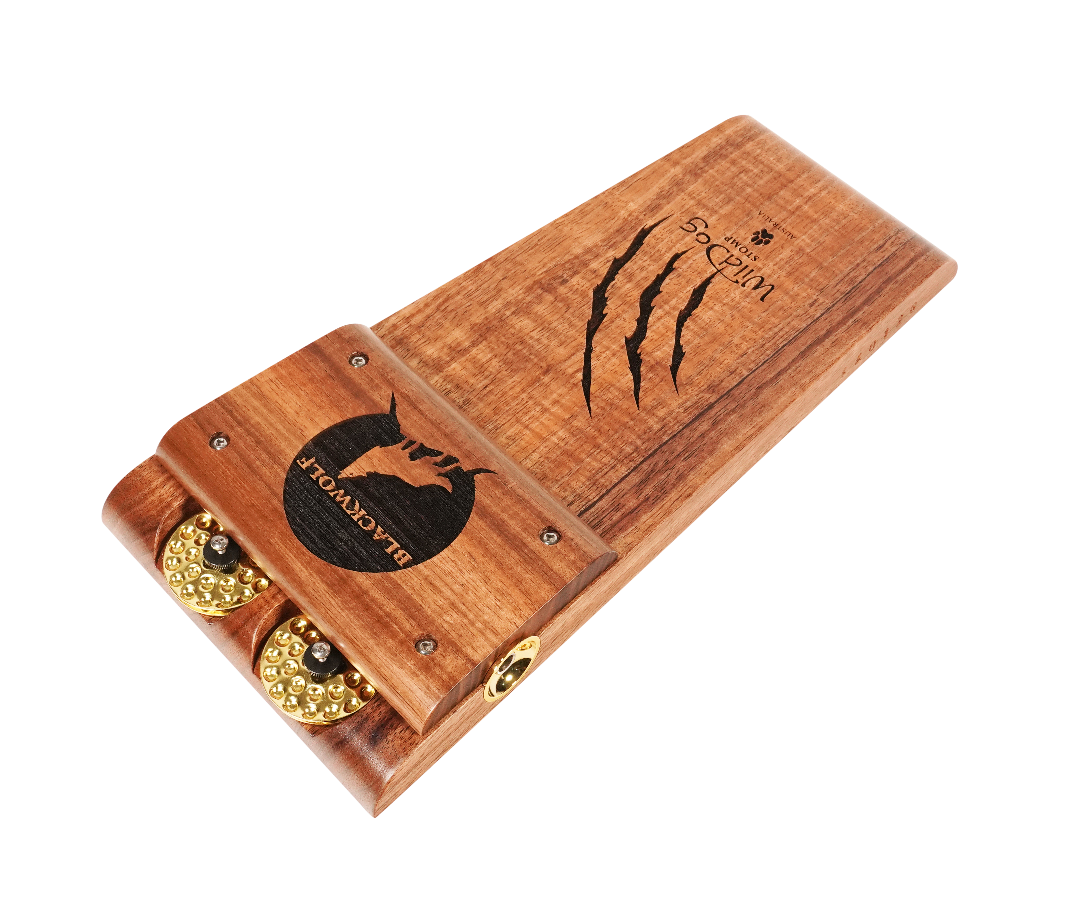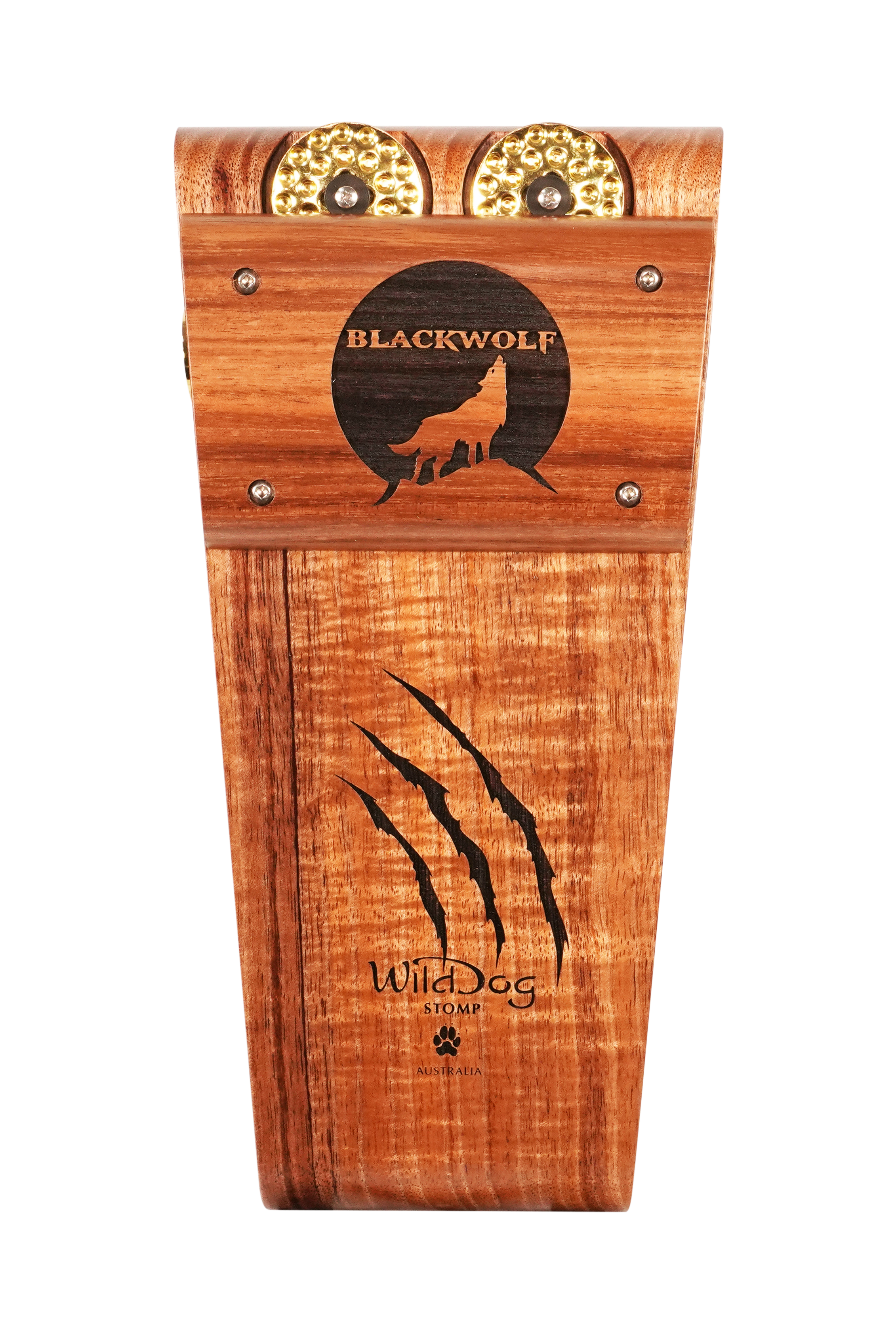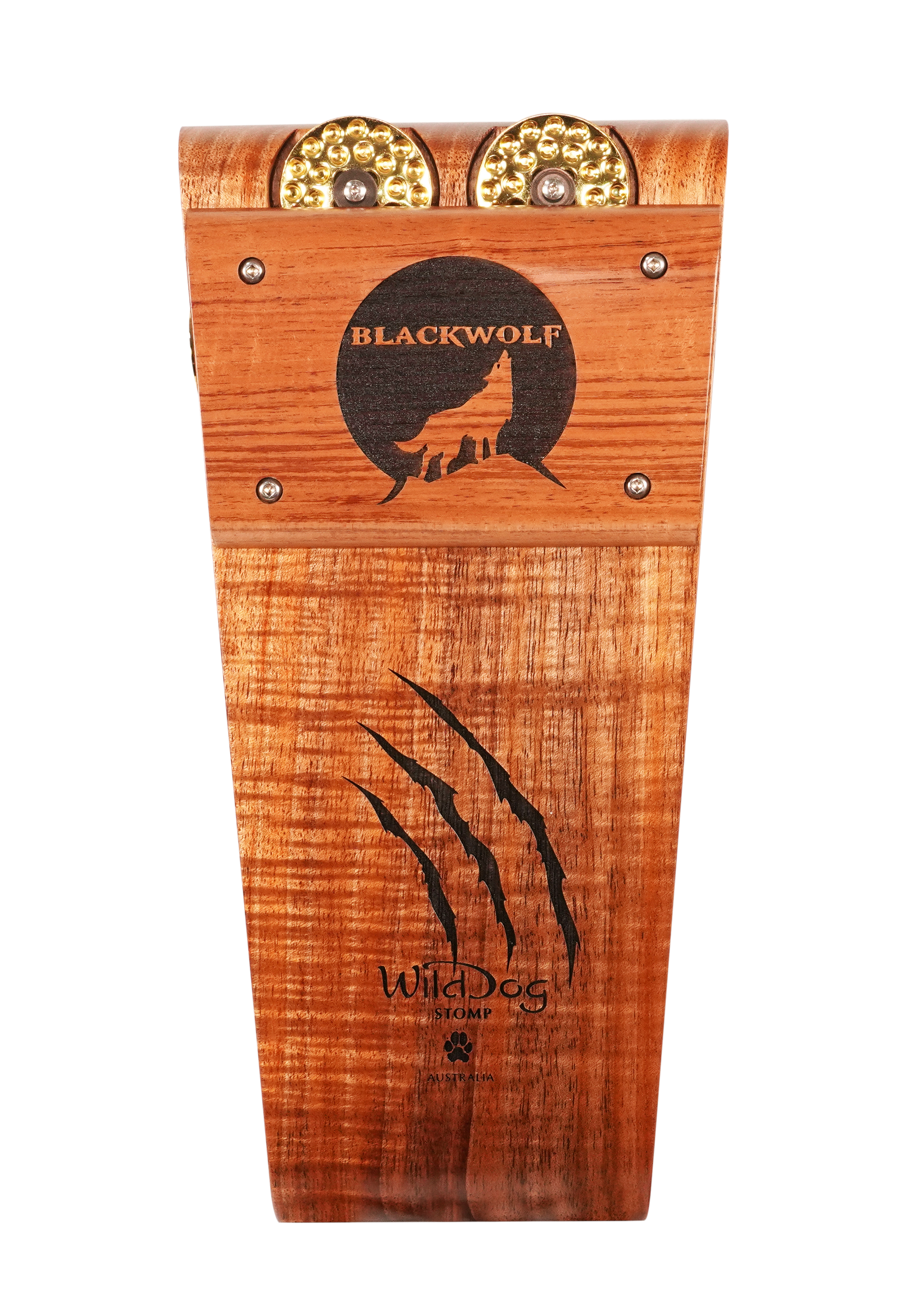 The Wild Dog Custom Shop Blackwolf Stomp Box is a premium rhythmic powerhouse built for players who demand striking aesthetics and massive acoustic tone. Handcrafted from richly figured Australian Blackwood, the Blackwolf delivers a thunderous bass response with a tight, punchy low end. Unique laser-etched claw marks and Wild Dog branding add a bold visual flair, while gold dimpled jingles and hardware elevate the look to boutique-level artistry.