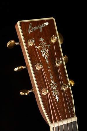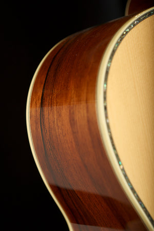 This stunning Bourgeois OM Custom showcases premium tonewoods and exquisite detailing throughout. Featuring a tight-grained Adirondack spruce top paired with richly figured Madagascar rosewood back and sides, it delivers a clear, powerful voice with excellent headroom and tonal depth. The traditional OM body shape provides a balanced response and articulate projection, making it ideal for both fingerstyle players and flatpickers seeking nuance and dynamic range.