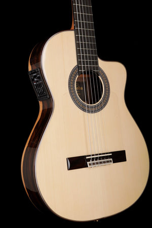 The Cordoba 55FCE Negra Classical Electric Guitar is the gold standard for nylon-string players who demand comfort, tone, and stage-ready electronics. With its thin body design, deep cutaway, and slightly narrower neck, this guitar delivers a familiar and fast-playing feel perfect for crossover players and live performers. Handcrafted in Spain, the 55FCE Negra features a solid European spruce top paired with exotic ziricote back and sides, producing a rich and complex tone with excellent projection—even in a thinbody format.