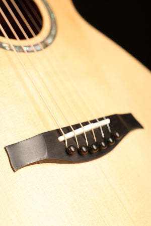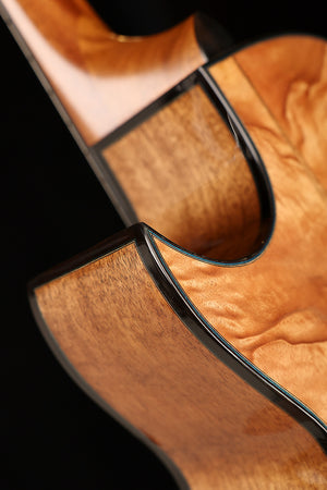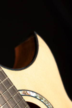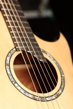 Handbuilt in September 2008 and recently rebuilt by David Worthy himself to align with his current build standards, this Sunbeam model is a superb example of Australian luthiery at its finest. The Sunbeam is a small-body, 12-fret design derived from David Worthy’s Vintage model, prized for its deep, resonant voice and exceptional sensitivity. With a Sitka spruce top paired to highly figured, quilted Queensland maple back and sides, this guitar delivers rich fundamentals, complex overtones, and a responsiveness that shines for fingerstyle playing, particularly in open tunings.