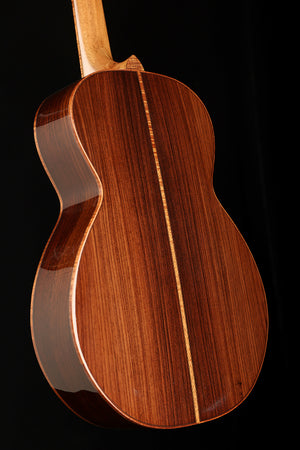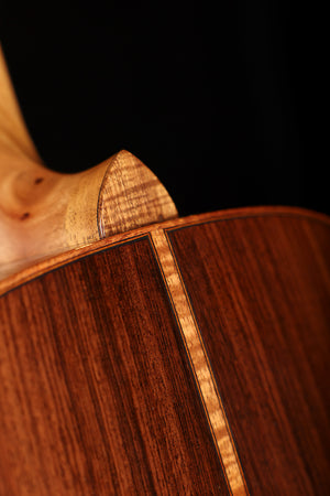 Originally conceived with distinctly old-world styling, the Vintage Model has evolved into a more expressive and visually striking instrument, blending classic proportions with tasteful modern appointments. Exotic figured blackwood binding, a spalted maple rosette and Waverly open-back tuners with koa buttons elevate the aesthetic, while hand-scalloped, tuned bracing and a carbon fibre–reinforced neck ensure long-term stability and exceptional tonal consistency. Built entirely by hand near Dandenong, this is a standout example of contemporary Australian luthiery.