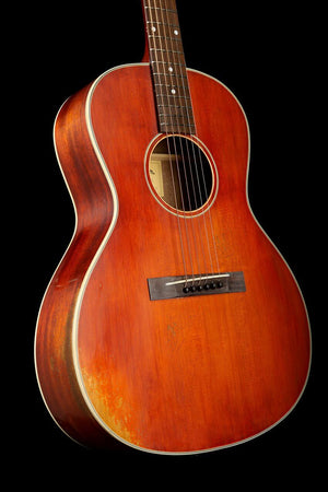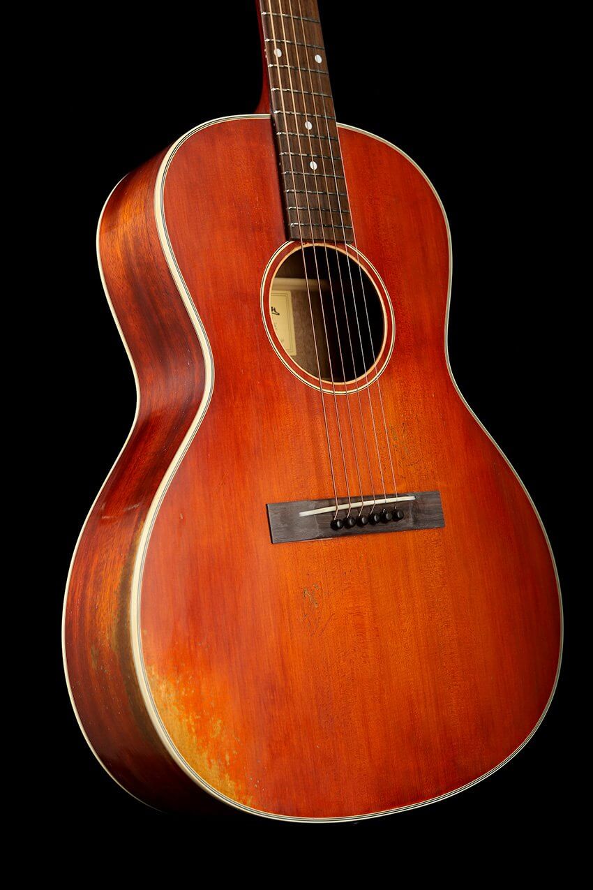 With Classic vintage 1930s and '40s-era flattop looks, great tone, and fantastic playability. A all Mahogany body delivers a smooth, rich and full sound in a comfortable OO style body that's perfect for fingerstyle players. With the amazing relic'd Antique Varnish finish, every guitar has an individual worn look.