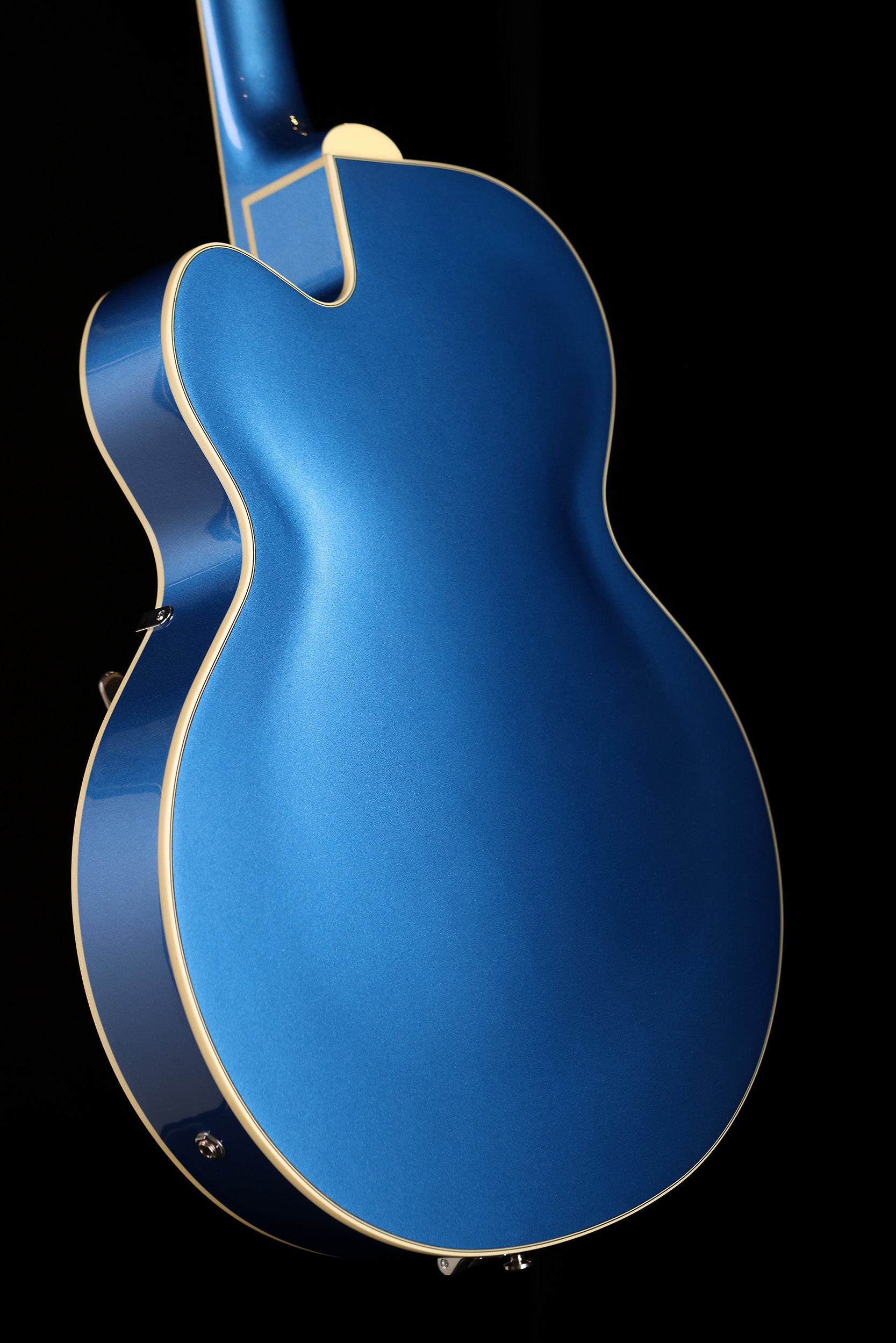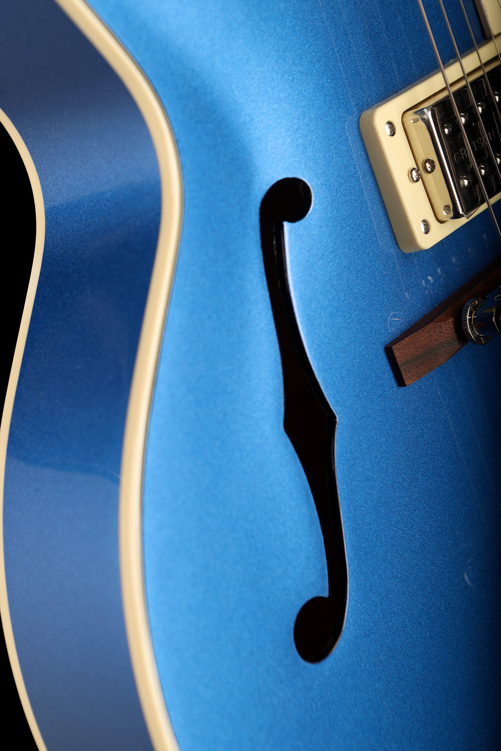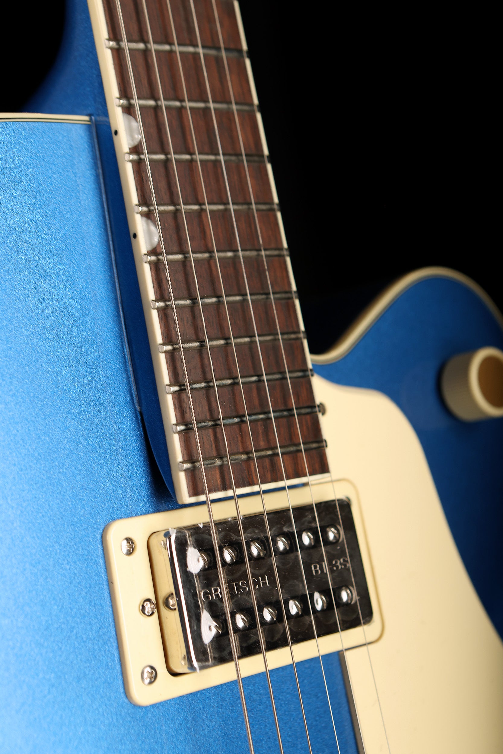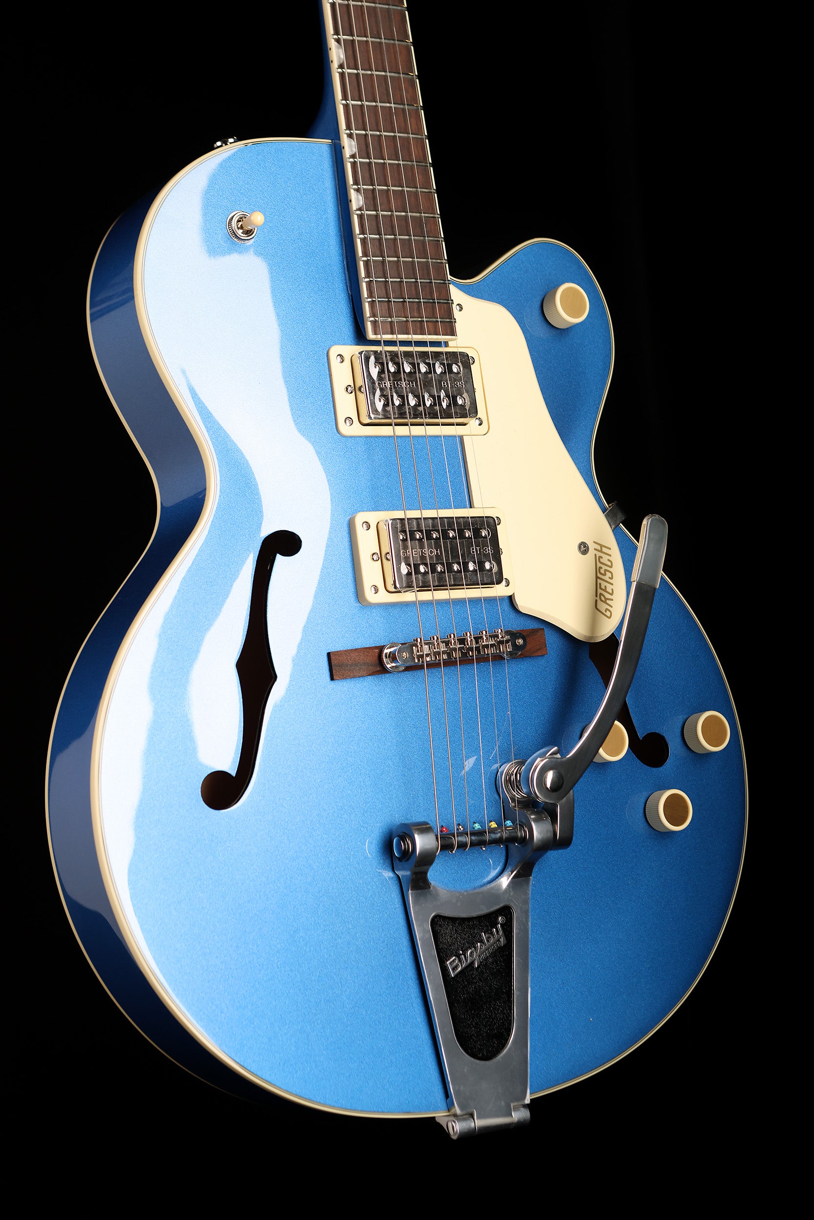 Comfortable and expressive, the G2420T’s soft “C” Nato neck with a 12-inch-radius laurel fingerboard feels smooth and familiar under the fingers. Vintage-inspired appointments like aged white binding, radio control knobs, and a Bigsby B60 vibrato tailpiece deliver timeless Gretsch elegance. With its bold Fairlane Blue finish and modern electronics, this guitar stands out as both a visual and sonic statement.