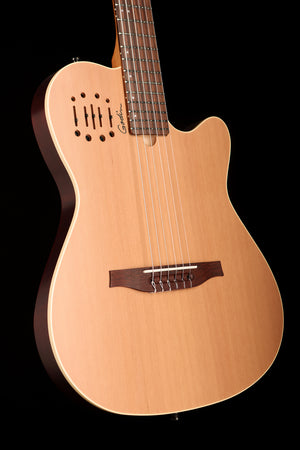 The Godin Multiac Grand Concert Encore Natural SG is a beautifully refined classical hybrid guitar built in Canada for players who demand superior tone, comfort, and stage-ready versatility. Combining traditional classical design with modern electronics, it features a solid cedar top paired with a two-chambered Canadian Laurentian basswood body that delivers exceptional warmth and resonance with reduced feedback — perfect for live performance and studio use alike.