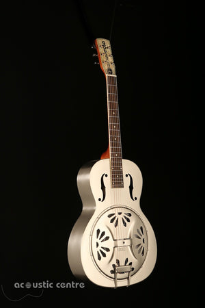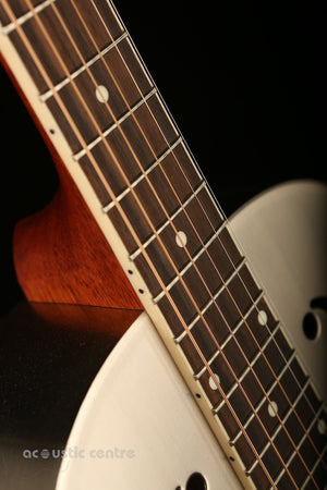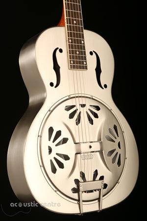 The Gretsch G9221 Bobtail Steel Resonator Guitar is a modern tribute to the resonator guitars of the 1930s, offering a blend of vintage aesthetics and contemporary playability. Its all-steel body delivers a bright, metallic tone with excellent projection, making it ideal for genres like blues, bluegrass, and folk. The hand-spun Gretsch Ampli-Sonic™ resonator cone, crafted from 99% pure aluminum, ensures rich tonal clarity and volume. Whether performing acoustically or plugged in via the Fishman® Nashville pickup, the G9221 Bobtail Steel stands out with its distinctive sound and classic design.