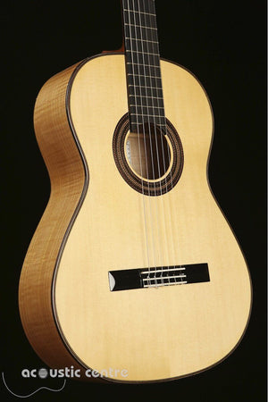 The Katoh Hauser Style Classical Guitar features a solid European spruce top and solid flamed maple back and sides, combining classic tonewoods to deliver a remarkable sonic experience. With its controlled overtones and direct sound, this instrument empowers the player to shape the tone with precision. Moving the right hand over the soundhole produces a liquidy, velvety quality, while towards the bridge, a brighter, brassy sound emerges. This guitar is ideal for those seeking maximum control over dynamics and modulation.