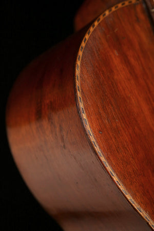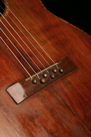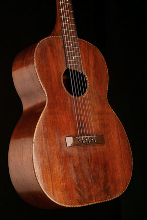 Surprisingly for a century-old guitar, the playability is great, with a deep V-neck profile and medium action. Currently set up with Silk and Steel strings (the guitar was probably strung with gut strings when new), it has a haunting, old-world tone with incredible character and depth. When tuned to slack key tuning, harmonics ring out beautifully and it becomes a beautiful slide guitar. The old-growth Koa selected for the guitar is stunning, with three-dimensional figuring throughout.