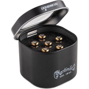Upgrade your acoustic guitar with the Martin Luxe Liquid Metal Bridge Pin Set – Gold with Pearl Dot. These premium pins are crafted from Liquidmetal®, a high-performance zirconium alloy known for its ability to enhance energy transfer between strings and guitar top. The result is a noticeable increase in volume, sustain, and clarity, all while maintaining the warm tonal character Martin guitars are famous for.
