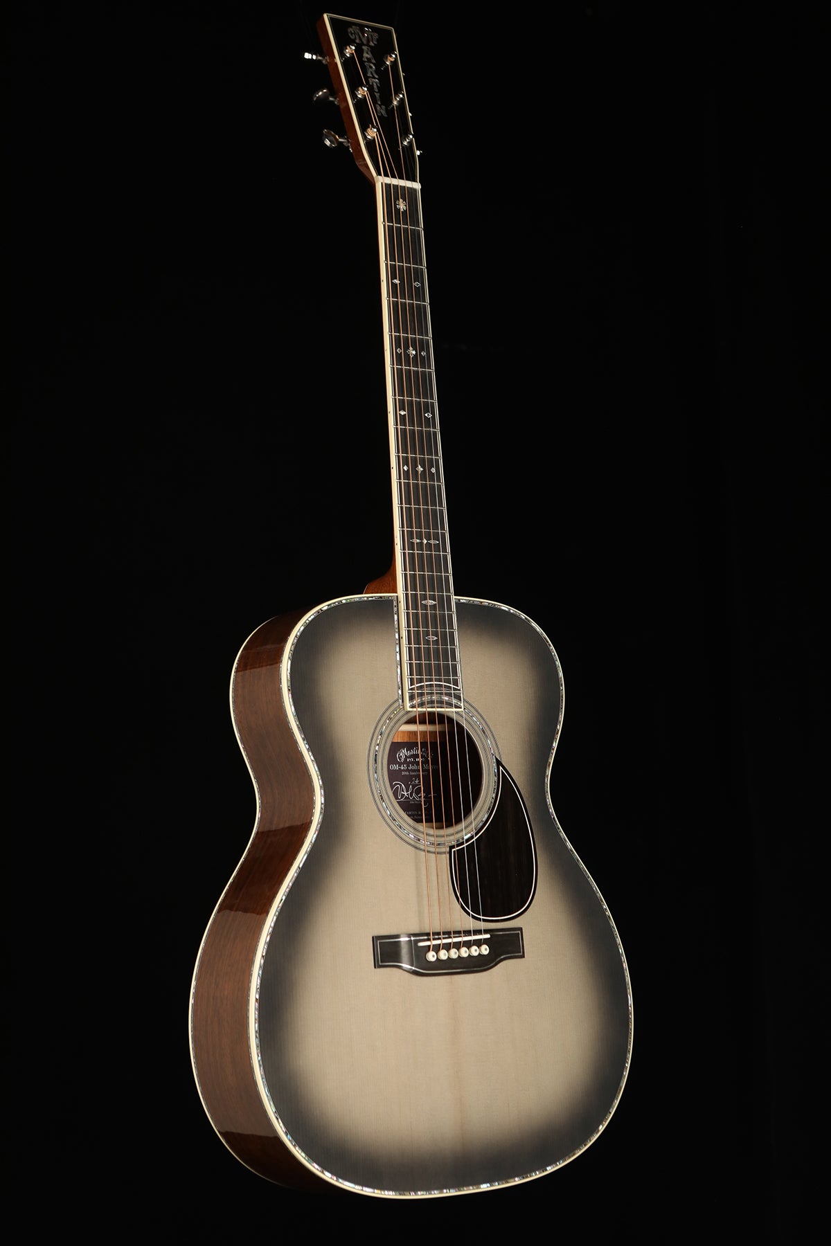 Accented with genuine silver trim on the headplate, pickguard, fingerboard, and bridge, the OM-45 John Mayer Anniversary model is visually striking and unmistakably refined. Its mahogany neck features a comfortable Modified V profile and a 1 11/16" nut width for streamlined playability, while the ebony fingerboard with abalone and mother-of-pearl inlays enhances both feel and appearance. Satin nickel Waverly tuners, scalloped X-bracing, and a bold Gray Sunburst finish complete this one-of-a-kind instrument that balances tone, artistry, and legacy.