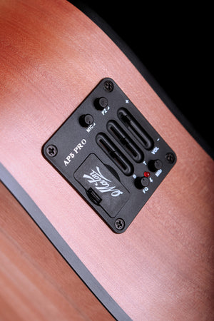 Solid Redwood top with Tasmanian Myrtle back and sides for rich, complex tone