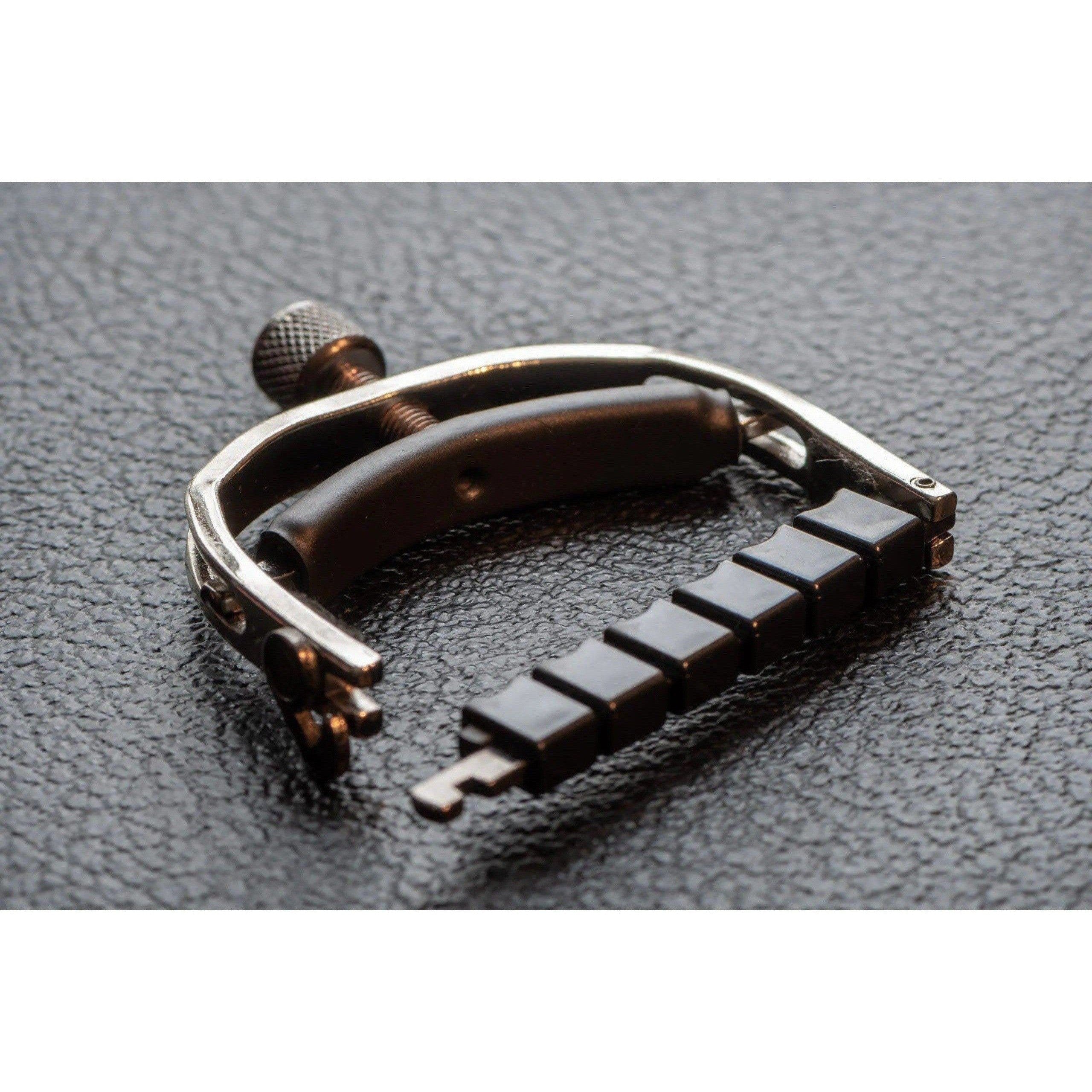Each ETI capo features individually molded outserts that hold strings perfectly centered—even after bending—along with a soft rubber pad that adjusts to the fretboard radius. This center-tension approach ensures even pressure across all strings and maintains tonal integrity without the need for excessive retuning. With its sleek profile, lightweight frame, and behind-the-nut storage, the P-6E-ETI is as practical as it is tone-enhancing—making it a go-to for serious acoustic players.