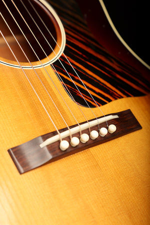 Built in Bozeman, Montana by Gibson’s master luthiers, the 1936 J-35 features a thermally aged Adirondack red spruce top paired with mahogany back and sides for a punchy, dry, and unmistakably vintage voice. Hide-glue bracing, a wide vintage-correct nut, and period-accurate construction details deliver crisp articulation, strong fundamentals, and a deep, resonant low end. The Murphy Lab Ultra Light Aged finish and lightly aged hardware add an authentic broken-in feel, giving players the look, response, and atmosphere of a well-loved pre-war Gibson—straight out of the case.