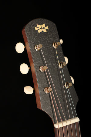 The Iris RCM-OOO ‘Blacktop’ is a refined, boutique 12-fret 000 designed for players who value balance, responsiveness, and understated vintage character. Featuring a slimmed-down body unique within the Iris lineup, the RCM-OOO delivers a dry, crisp, and punchy voice with excellent midrange definition and clarity. The Blacktop aesthetic, paired with the flower headstock logo, ivoroid binding, and ivoroid pickguard, gives this guitar a striking yet tasteful visual presence rooted in classic American flattop design.