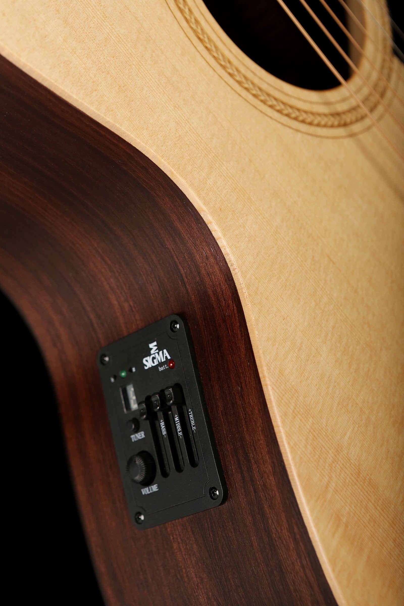 The Sigma GTCE is a beautifully crafted grand OM-style acoustic-electric that offers rich tone, refined design, and stage-ready performance — all at a remarkable value. Featuring a solid Sitka spruce top paired with tilia back and sides, this guitar produces a balanced sound with clear highs, warm mids, and tight low end. The 14-fret cutaway body allows for comfortable access to upper frets, making it a versatile option for fingerstyle, flatpicking, and light strumming.