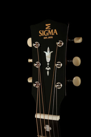 The Sigma SJM-SG45+ is a vintage-inspired slope shoulder dreadnought that delivers rich, powerful tone and standout craftsmanship. With a solid Adirondack spruce top and solid mahogany back and sides, this guitar produces bold projection, woody warmth, and dynamic clarity — perfect for singer-songwriters and Americana players. Its shorter 24.75” scale length and slope shoulder design enhance playability while adding a distinct tonal flavor.