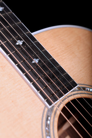 A neo-tropical mahogany Standard Carve neck paired with a 15" radius Crelicam ebony fingerboard ensures effortless playability across all 20 frets. For stage use, the LR Baggs Element VTC pickup system faithfully captures the guitar’s natural resonance, offering warm, authentic amplified tone. Complete with elegant diamond inlays, white binding, and a gloss natural finish, the 815e Legacy is both a powerful performance tool and a timeless piece of craftsmanship.