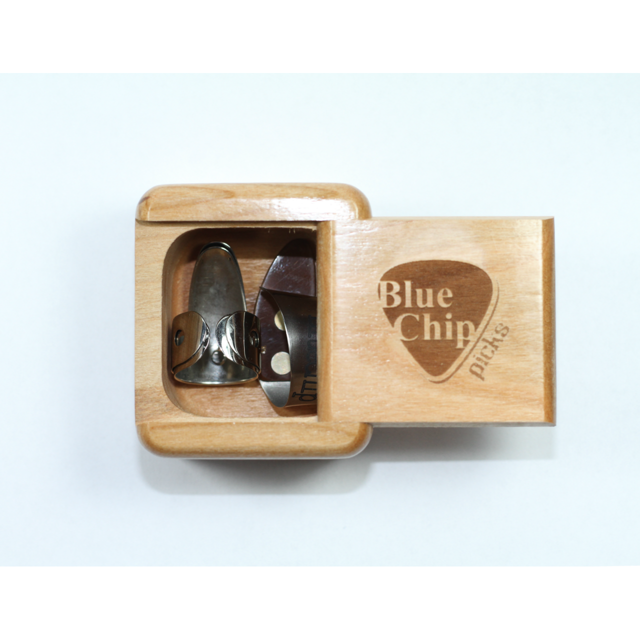 A beautiful, hand crafted, cherry box for safely storing your BlueChip flat picks or thumb pick and fingerpicks. Box is 1.375" deep by 2" square. This high quality, custom box is laser engraved with the BlueChip logo. The fit and finish quality is the same precision as you have come to expect from our picks. The top sliding door fits so well that it appears that there is no door at all, yet it slides smoothly open.